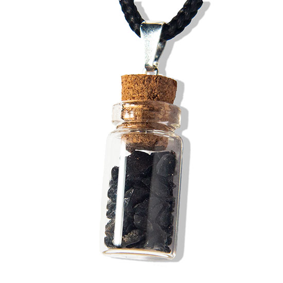 Amuleto de cura emocional e espiritual para quem o utiliza. Presilha prateada com pedrinhas de ônix preto dentro da garrafinha de vidro.