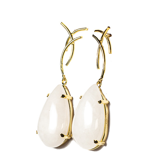 Brinco Pedra Quartzo Leitoso, lapidação Gota totalmente artesanal. A montagem é feita Garra banho flash dourado