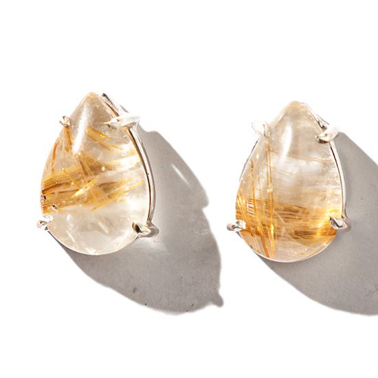 Brinco Topinho Pedra Rutilo no Quartzo Natural Cabochão Gota Lisa 12mm Lisa montado na Garra Prata 950, Pedra Quartzo Natural de Boa Qualidade mineral não é pedra de laboratório como esta cheio o mercado, a montagem Prata 950 com garras para segurar a Gema. Lapidação da Pedra em formato de Gota com Acabamento Liso e Base reta.
