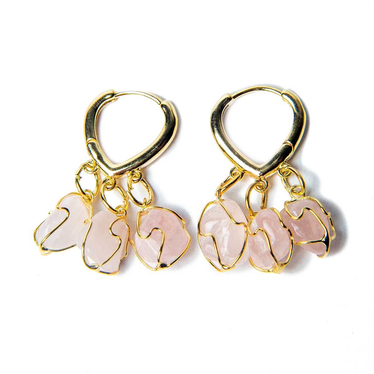 1 par de brincos dourados com três corações de Quartzo Rosa natural, prontos para uso