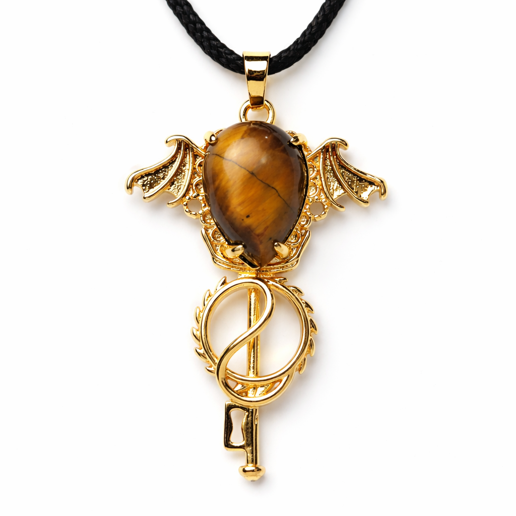 Descubra a força magnética do Olho de Tigre Natural, lapidado em formato de gota e montado em um design gótico exclusivo com asas de morcego e detalhe de chave, em banho dourado. Uma peça marcante que une proteção energética, simbolismo místico e sofisticação intensa para quem carrega personalidade forte e estilo autêntico.