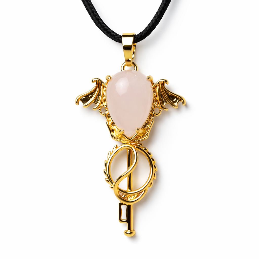 Descubra a delicadeza vibracional do Quartzo Rosa Natural, lapidado em formato de gota e montado em um design gótico exclusivo com asas de morcego e detalhe de chave, em banho dourado. Uma peça marcante que une amor, proteção energética e simbolismo místico para quem deseja expressar sensibilidade com personalidade forte.