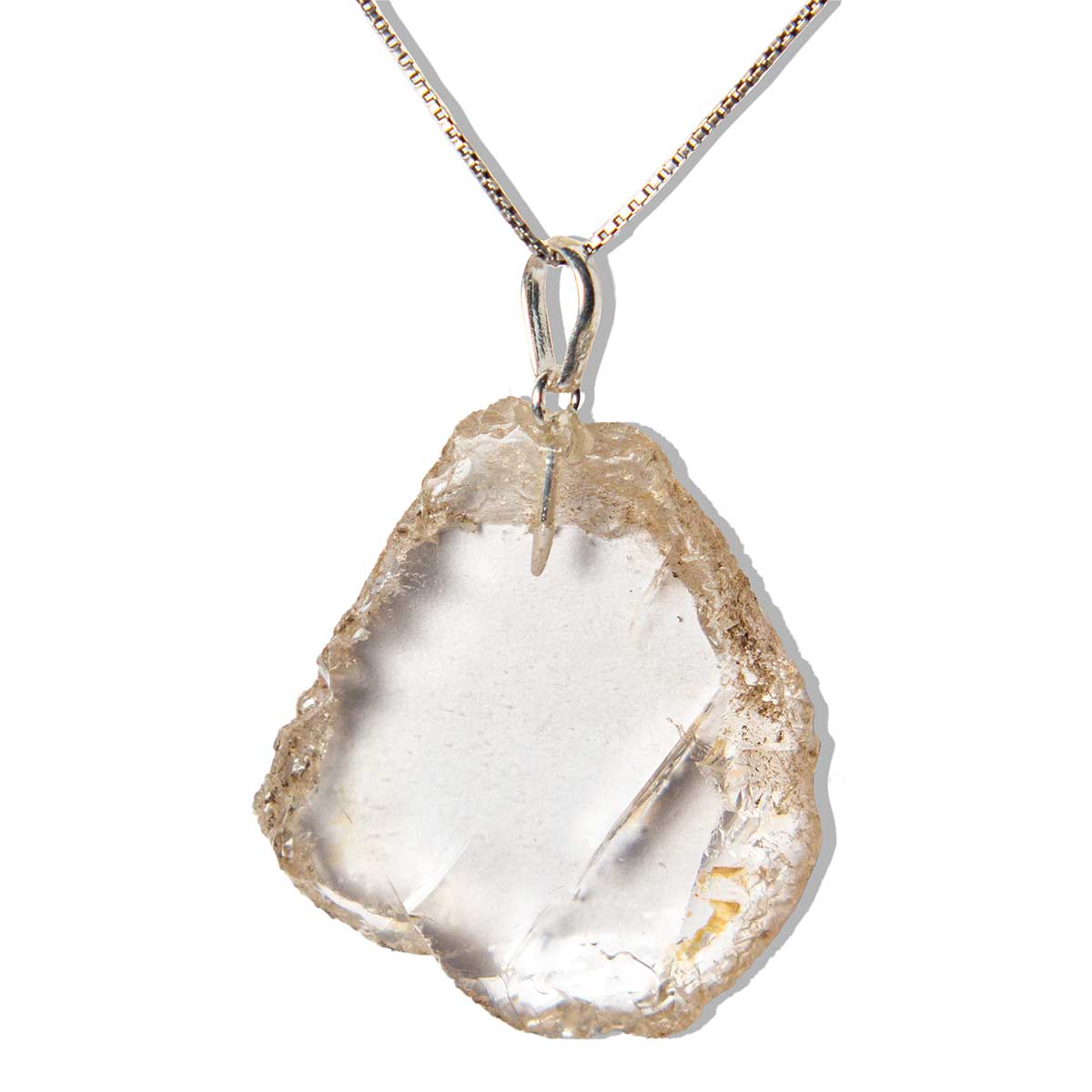Pingente de Chapinha de Topázio Branco/Incolor, montado em Prata 950 (prata de lei) com pino e perinha. Produção artesanal de alta qualidade, garantindo autenticidade com origem em garimpo. O Topázio Branco é conhecido por favorecer a clareza mental, alinhar as energias e promover equilíbrio espiritual.