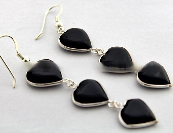 Brinco 3 Corações Pedra Onix Preto, a montagem PRATA 950 envolto as pedras com gancho anzol para segurar as 3 pedra que é lapidada em formato de Coração pequenos e leves