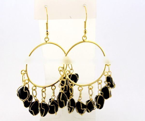 Brinco Argola Pedra Turmalina Preta Lapidação Rolada com montagem anzol e pedra na cesta dourado, lapidação totalmente artesanal. A montagem é feita em banho flash dourado