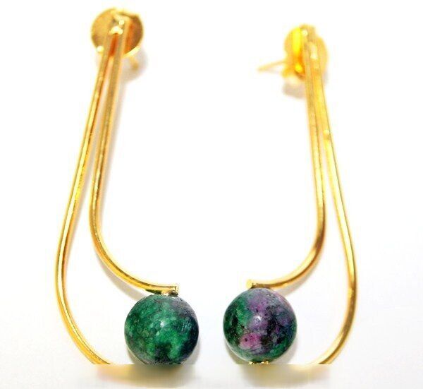 Brinco Boomerang Pedra Rubi na Matriz de Coríndon, lapidação Bolinha totalmente artesanal, a montagem é feita com uma montagem modelo Boomerang e banho flash dourado + Bolinha de Pedra.
