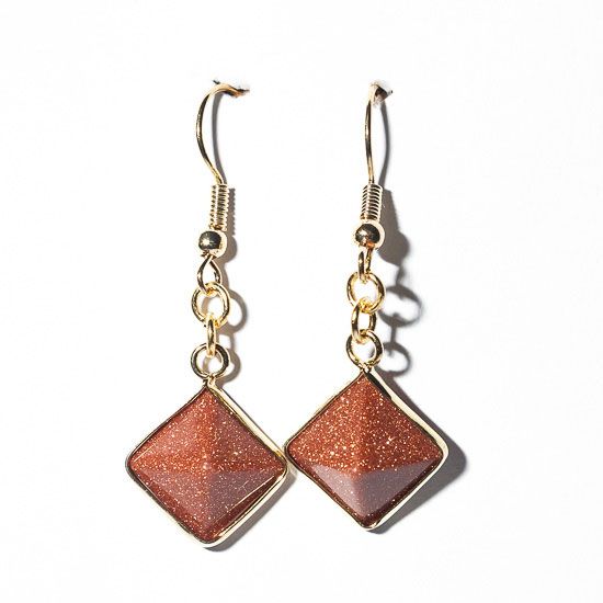 Brinco Mini Pirâmide Pedra do Sol Montagem Anzol Banho Dourado, Pedra totalmente artesanal com polimento em vibrador a montagem é piramide envolto mais Anzol com banho dourado.