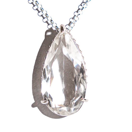 Pingente Gota Facetado Pedra Cristal. Gema Natural de Garimpo, pingente com montagem na garra em Prata 950 envolto com zircônia branca, dando um toque de brilho para passar o cordão. Pedra Genuina com origem garimpo lapidação Facetada Manual e montagem manual. Possui a base multifacetada, dando assim, mais brilho e transparência à face da pedra.