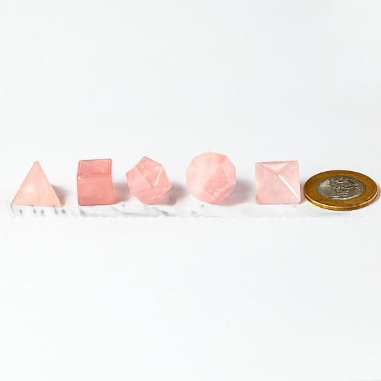 Kit solido de platão formas geometricas lapidado em pedra natural de garimpo com boa qualidade, Tetraedro, Hexaedro, Octaedro, Dodecaedro, Icosaedro ideal para coleção, estudo, presente etc. Solidos de Pedra Quartzo Rosa Lapidação Manual.