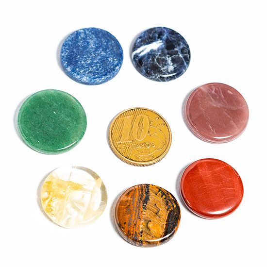 Kit 7 Chakras Disco 20mm Pedras Naturais Pequenas Kundalini Stone, Kit de alinhamento 7 Pedras do chaKras lapidadas em disco ou pastilha pra facilitar no uso