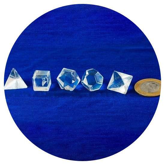 Cada peça do conjunto representa uma das cinco formas geométricas associadas aos elementos da natureza segundo a tradição filosófica de Platão, tornando o kit ideal para práticas energéticas, estudos geométricos, coleções ou uso decorativo.