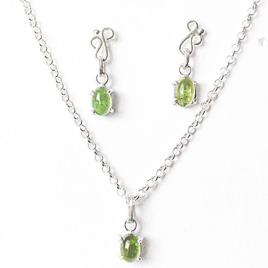Elegância brilhante em cada detalhe: Conjunto Colar e Brinco Cabochão Turmalina Verde na garra Prata 950. Perfeito para realçar sua beleza!