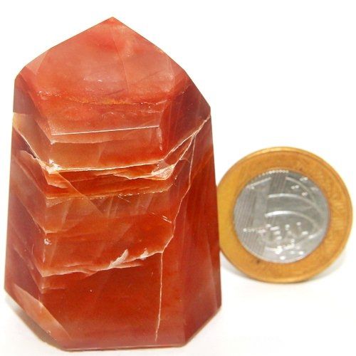 Ponta de aragonita vermelha, brilhante e vibrante, encantando com sua beleza natural. Ideal para decorar ambientes ou para proteção!