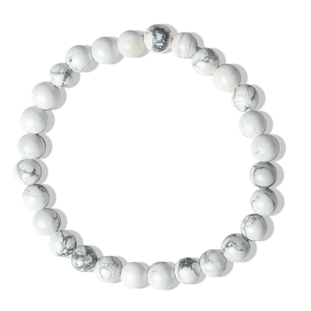 Pulseira de Howlita Branca com esferas de 6 milímetros, cuidadosamente lapidadas com acabamento suave. Montada com furo central e fio de silicone, adapta-se a diferentes tamanhos de pulso, com fácil manutenção — basta substituir o silicone e ajustar o número de pedras conforme necessário.